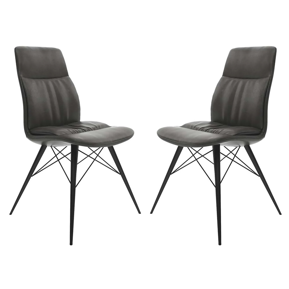 Upgrade your dining space with the Alexander Vintage Grey Leather Dining Chairs In Pair. Crafted in premium faux leather with a contemporary grey finish, these chairs blend versatility and style for any dining setting. A double-padded seat back with lumbar support and a dense cushioned seat ensure lasting comfort during long meals, while sturdy graphite-painted steel legs provide reliable stability. The ergonomic, gently curved backrest and easy-clean surface make them ideal for everyday dining or entertaining. Space-saving design, minimal assembly, and a timeless colourway make them a practical addition to kitchens, dining nooks, and dining rooms alike. Pair includes two chairs, ready to refresh your dining configuration with elegance and comfort.
